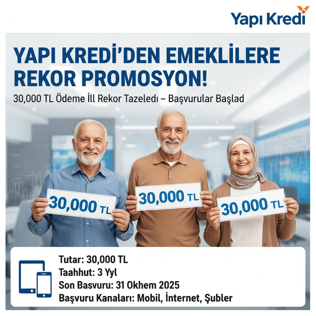 [İstanbul] – [06 Ekim 2025] – Türkiye’nin önde gelen bankalarından Yapı Kredi, emekli müşterilerine yönelik promosyon kampanyasını güncelleyerek, sektörde dikkat çekici bir hamleye imza attı. Banka, 2025 Ekim ayı itibarıyla emekli maaş promosyon tutarını tam 30.000 TL‘ye yükselttiğini duyurdu. Bu rekor promosyon ödemesi, emekliler arasında büyük yankı uyandırırken, finansal rahatlama arayan milyonlarca emekli için cazip bir fırsat sunuyor.